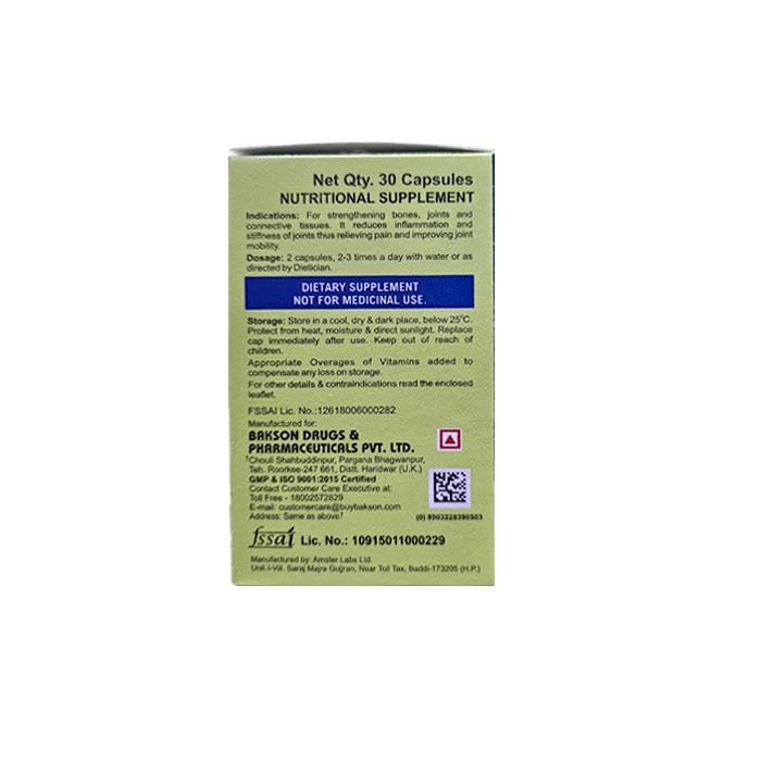 Bakson’s Flexi Care helps strengthen the bones, Reduces joint inflammation and swelling, Improves joint mobility, Aids in collagen synthesis.